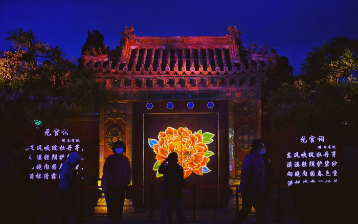 今年的夜赏牡丹活动,还将赏花观景与牡丹文化相结合,打造晚间游园赏花新热点。在古建院落观德殿南门及两侧围墙设置图案灯,在红墙光影中为游客呈现牡丹绽放盛景,游客徜徉于中轴古建地标之中,不仅能欣赏到夜幕下国色天香的朦胧美,还能在古建光影中品读牡丹诗词歌赋,沉浸式感受牡丹与中轴古建相得益彰的文化韵味。
