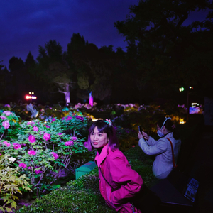 4月21日,景山公园,游客在灯光照亮的牡丹园内拍照。新京报记者 薛珺 摄