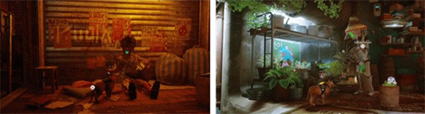 有关非人类的实存问题并不像追问人类之实存的加缪的《异乡人》或萨特的《存在与虚无》那样晦涩难懂。在《stray》中,机器人与猫咪、还有猫博格(catborg)人工智能无人机是一种互助的伴生关系。可以说这是游戏可以选择的最具智慧的设定。搭载人工智能的小型无人机B-12不断给玩家(即猫咪)发送唤醒自己的信号,之后会成为玩家探索空间的辅助。搭载了猫咪专用可穿戴设备的B-12是机器之神般的存在,它就是为了和生动的非人类世界进行交流而存在的。它可以照亮黑暗的空间,将猫咪收集的道具数字化后保存起来,在“companion”和猫咪之间用机器语言提供翻译。玩家最先在B-12身上拿到前往外界的拼图线索,B-12也担负起在玩家面临危险时(电源因超负荷关闭或各种功能停止运转时)提供救援的作用。