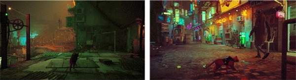 《stray》讲述了一只流浪猫失足掉落到衰败的地下城后的逃离冒险。玩家完全从猫咪视角出发探索空间,寻找回家的路。人类感觉和人类思考方式在这里是行不通的。游戏中,打开门的方式不应是转动门把手而是挠门让他者给你开门。大多数时候玩家不是行走在街道上而是攀爬穿梭于各种建筑。对于在任何地方都用四脚着地的猫咪来说,人类的平面运动多少有些无聊。作为一只无名猫,最常去的地方是通风口、管道和露台栏杆。除了超人之外的人类是不会用这种方式去探索空间和行走的。在《stray》中,玩家应最大程度地摆脱用人类感觉去思考问题。该游戏利用精准的水准测量设计了高耸入云的城市幕景,最大程度地优化了猫咪在每个阶段的动线。