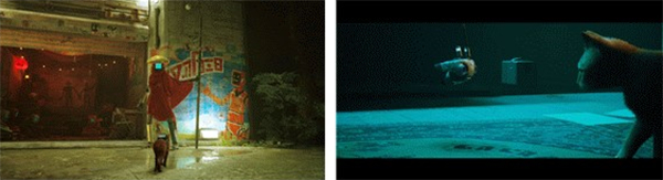 玩家可以发现作为人类时很难发现的秘密场所,或是能够挤进门缝和铁栅栏间,又或是可以轻松跳到数百米下然后移动到旁边的建筑。我们在猫咪复杂多变的动作中体验到了作为人类时体会不到的感觉。随意跨过的轮胎,锈迹斑斑的油桶,混凝土垃圾都巧妙地成为了猫咪逃跑的路线。《stray》将作为产业文明基石的机器和城市描绘成一个了无生气且危险阴暗的空间,一个没用的垃圾堆。借用媒介学者伊恩·博格斯特(Ian Bogost)的话来说就是,文学侧重象征和解读,而游戏侧重探索和冒险,游戏中的 “程序修辞(procedural rhetoric)”使猫咪的行动和立体的城市冒险体验成为可能。