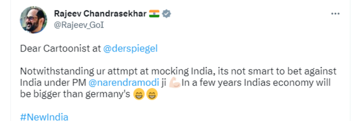 有推特网友嘲讽道,“亲爱的《明镜周刊》漫画家,尽管你们试图嘲笑印度,但与莫迪总理领导下的印度对赌并不明智。几年内,印度的经济规模将超过德国”。↓