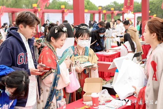 北京主会场现场设置了“国风市集”“互动体验”“文化展演”和“文化讲堂”等展示区域。在“国风集市”上,多所高校和近30家商家现场展示非遗文化、华服及饰品,给游客带来直观的传统文化体验。在“互动体验”区,年轻人体验和学习蹴鞠、投壶、棋艺、采选、品茶、糖画等传统技能,还有高手现场行“飞花令”,猜谜对诗,切磋琢磨。