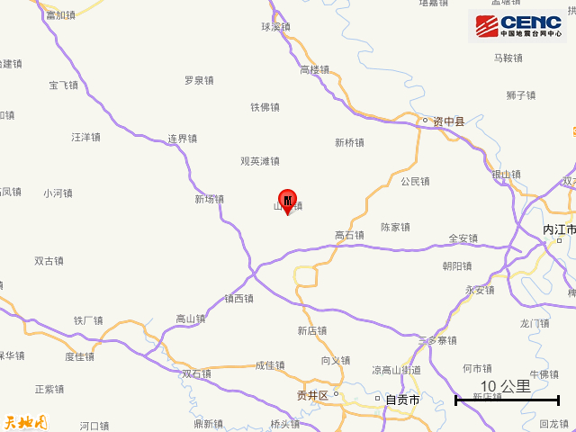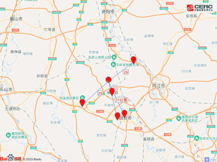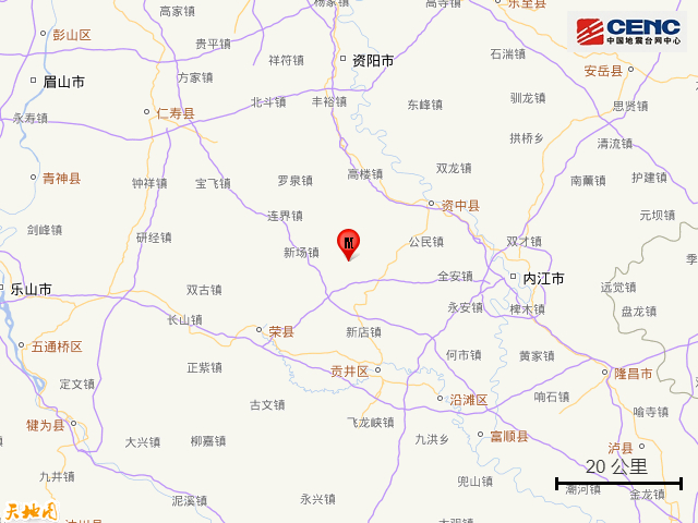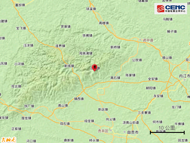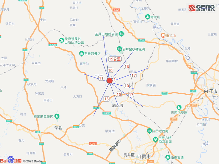 周边县城:震中距威远县11公里、距资中县26公里、距荣县29公里、距大安区31公里、距贡井区31公里,距自贡市34公里,距成都市127公里。