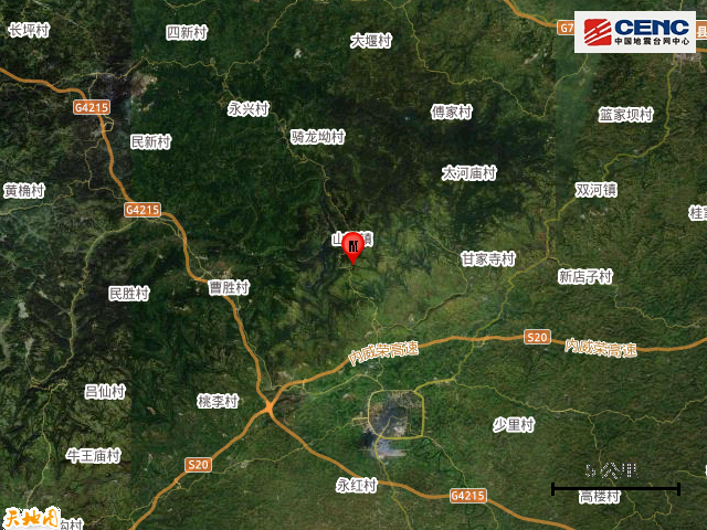 震中地形:震中5公里范围内平均海拔约574米。