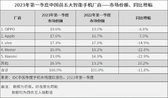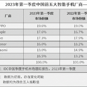 2023年4月27日,国际数据公司(IDC)发布的最新数据显示,2023年第一季度,中国智能手机市场出货量约6,544万台,其中OPPO(含一加)以19.6%的市场份额排名国内手机市场第一。