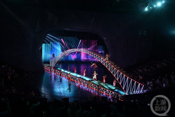 更令人惊叹的是,演出中杂技演员们站上了这座“大桥”表演各种绝活儿,把道具与技艺融合得非常巧妙,展示出了“道技结合、技舞共融”的水平。而轨道列车穿楼除了被复刻到舞台上之外,它还环绕舞台高空,在观众头顶完成了空中穿梭。