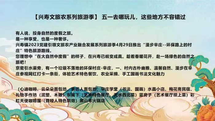 看演出、逛市集……2023党建引领文旅农产业融合发展系列旅游季“慢步辛庄——环保市集”开集仪式将于“五一”假期首日(4月29日)在兴寿镇辛庄村举行,持续到7月29日结束。