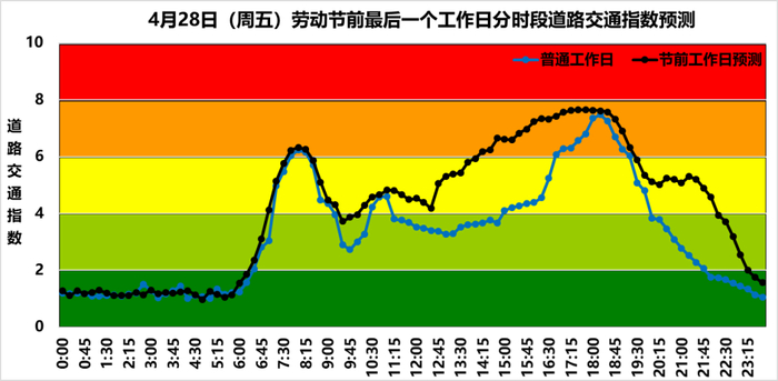 4月28日(周五,限行尾号3和8),劳动节前最后一个工作日,预计石景山区交通出行将呈现节前出行特征。下午和晚高峰时段道路拥堵情况较突出,交通指数可能达到7以上的“中度拥堵”级别,路网约下午14:00左右进入“中度拥堵”状态,持续至19:15左右结束,下午时段路网“中度拥堵”及以上级别持续时间约5小时15分钟。