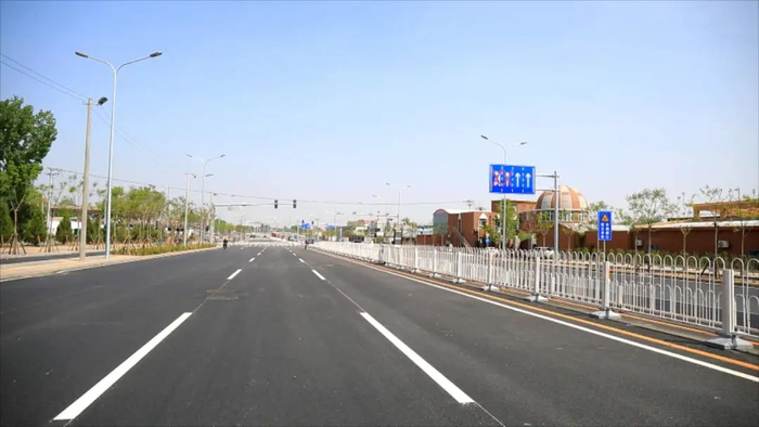 目前,大部分路段的路面基本完成了沥青的铺设并施划了标识线,部分路面还在施工中,同时道路两侧的非机动车道已经栽种了绿植。