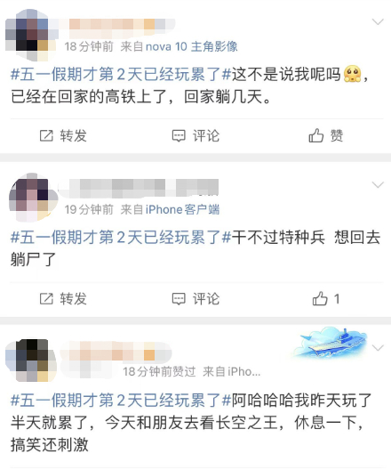 今天,一个话题词#五一假期才第2天已经玩累了#,引起了不少网友的共鸣,大家纷纷表示:“这不就是我吗…”!