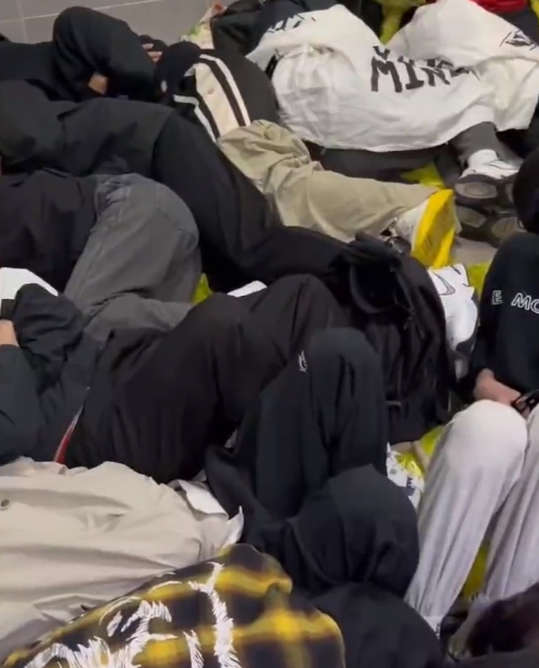 据视频显示,许多人或坐或躺在厕所里过夜,有人盖着毯子,有人则穿着单衣席地而坐。现场还有语音提醒:“如果您执意夜宿,请您遵守公共秩序,不要影响他人正常如厕。”