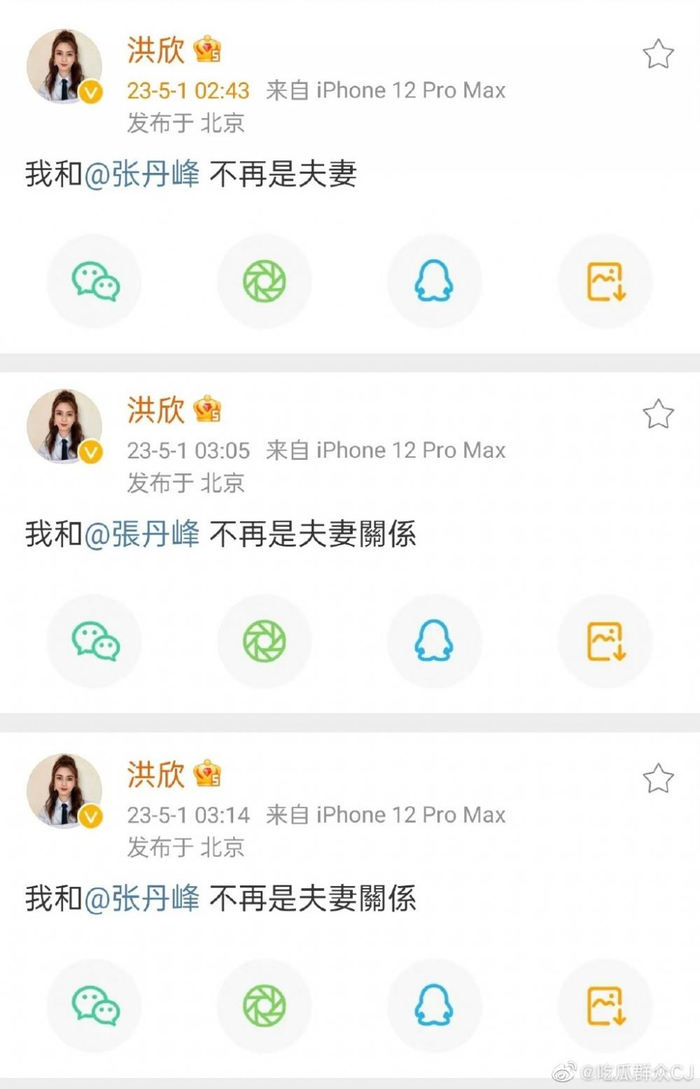 5月1日凌晨,洪欣突然连发三条微博宣布离婚,表示和张丹峰不再是夫妻关系,并且艾特张丹峰本人。