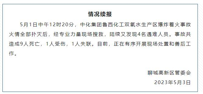 5月1日中午12时20分,中化集团鲁西化工双氧水生产区爆炸着火事故火情全部扑灭后,经专业力量现场搜救,陆续又发现4名遇难人员。事故共造成9人死亡,1人受伤,1人失联。目前,正在有序开展现场处置和善后工作。
