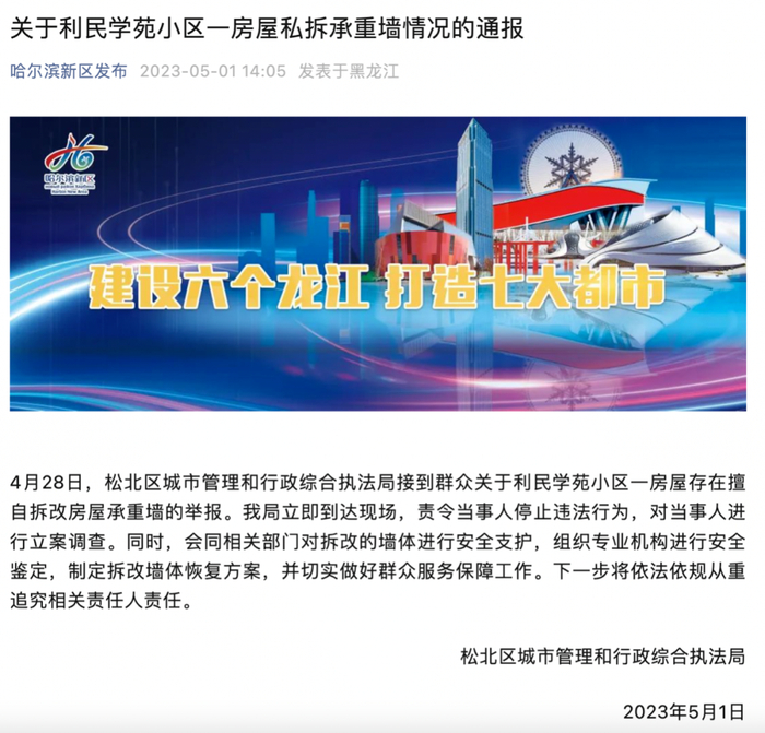5月1日,哈尔滨市松北区城市管理和行政综合执法局发布通报称,接到群众关于利民学苑小区一房屋存在擅自拆改房屋承重墙的举报,已责令当事人停止违法行为,对当事人进行立案调查。同时,会同相关部门对拆改的墙体进行安全支护,组织专业机构进行安全鉴定,制定拆改墙体恢复方案,并切实做好群众服务保障工作。下一步将依法依规从重追究相关责任人责任。