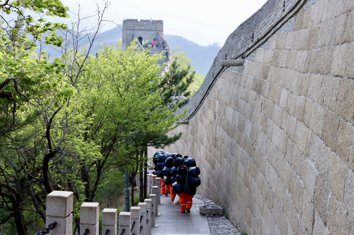 据了解,小长假期间,景区环卫工人们5天共清运垃圾10余吨,是日常工作量的3倍,并且都是通过人拉肩扛的方式,从长城一步步运下来的。同时,为了保障景区环境卫生,坚守一线的长城环卫工人增加到了182人,其中城上45人专门负责长城上的垃圾捡拾。在进行垃圾分类后,由人工背下来,在整个“五一”期间,八达岭物业公司保洁分公司共运行105车次,清运固体垃圾约30吨、液体垃圾20余吨。