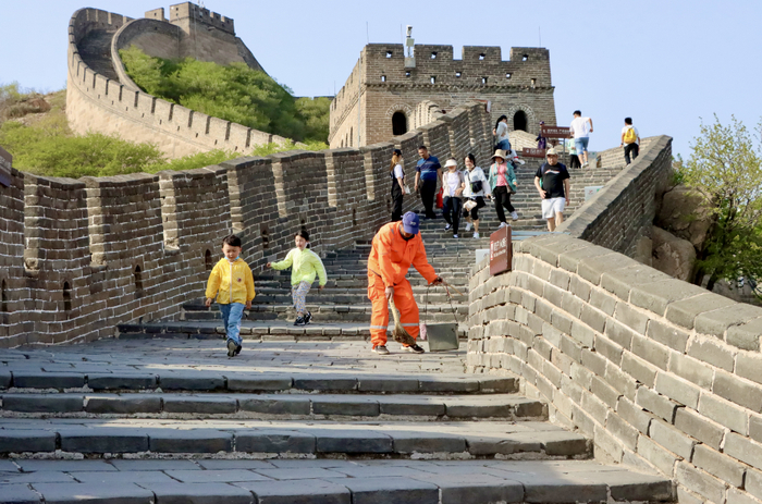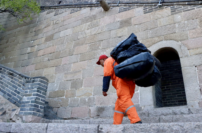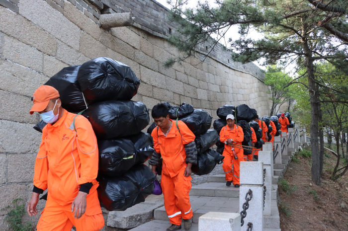 在熙攘的游客中,有一抹亮丽的色彩在晃动,他们就是身着橙色制服的环卫工人,在险峻的城墙上辛勤工作,高峰期每天要背近100余斤垃圾下山。除了保障景区的环境卫生,环卫工人们也用自己的真诚行动,为游客提供力所能及的帮助。