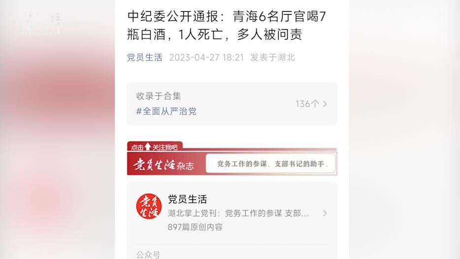 此前报道:快评丨青海6厅官聚众饮酒1人死亡,顶风违纪坏风气伤民心