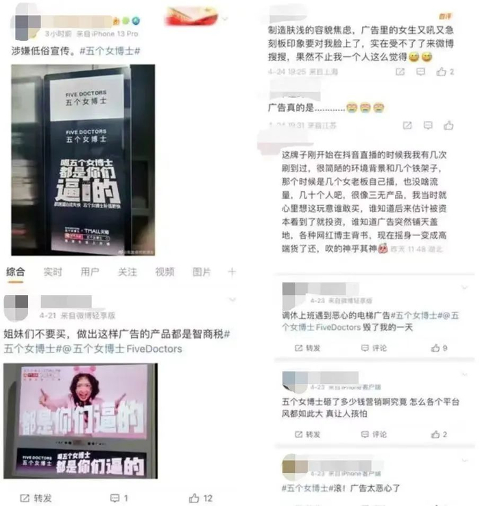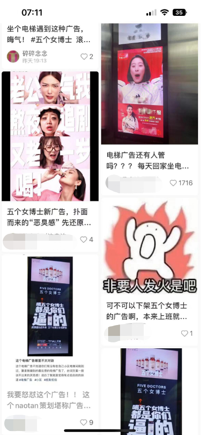 近日,一个名为“五个女博士”的品牌投放的一则电梯广告引发争议,广告中一位女性面目狰狞,握拳嘶喊“老公气我,喝”“熬夜追剧,喝”“又老一岁,喝”“喝五个女博士,都是你们逼的!” ,引起了不少网友的不满和反感,有网友称其“宣传了女性的负面刻板印象”“贩卖性别焦虑”。