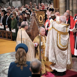 在威斯敏斯特教堂,查尔斯坐在14世纪的加冕椅上。在大约100位来自世界各地的领导人和无数电视观众的注视下,英国圣公会精神领袖坎特伯雷大主教缓缓将有着360年历史的圣爱德华王冠戴在查尔斯的头上。 查尔斯的第二任妻子卡米拉加冕为王后。