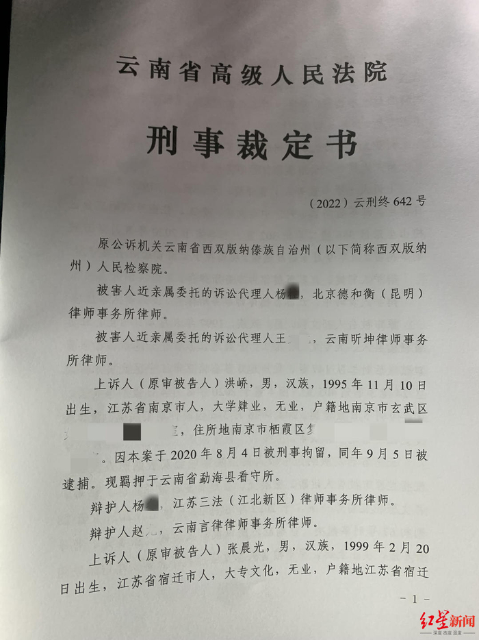 今年7月,云南省西双版纳傣族自治州中级人民法院一审公开宣判本案,主犯洪峤被以故意杀人罪判处死刑,剥夺政治权利终身;主犯张晨光、曹泽青分别被以故意杀人罪判处死刑,缓期二年执行,剥夺政治权利终身。