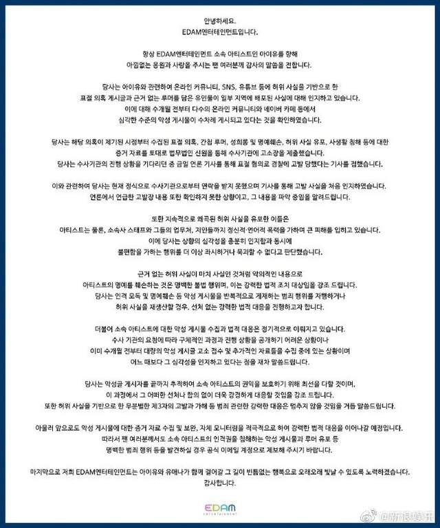 对此,IU经纪公司回应:“我司目前尚未收到调查机关的通知,首次通过报道得知了指控的事实。媒体提及的告发状内容也没有确认,正在掌握其内容。”
