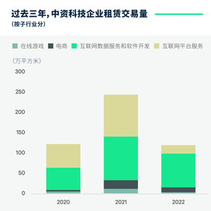 资本市场改革的持续深化是推动证券基金机构业务扩张的动因。2022年,证券/基金/期货/信托行业在中资金融企业租赁交易量中的占比达到50%,较2020年上升14个百分点。与此同时,国内科技互联网行业持续向“数实融合”领域和核心科技研发转型升级也已初见成效,行业新增长引擎逐渐加速。数据显示,以人工智能、云计算为代表的互联网数据服务以及软件开发企业租赁交易量在科技行业中的占比从45%大幅增加至69%。