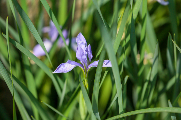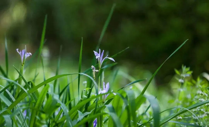 马蔺又叫兰花草,是鸢尾科鸢尾属的多年生密丛草本,花常开放在叶丛中,花瓣狭长,淡蓝色的花瓣上常有较深色的条纹。叶色青绿,花淡雅美丽。