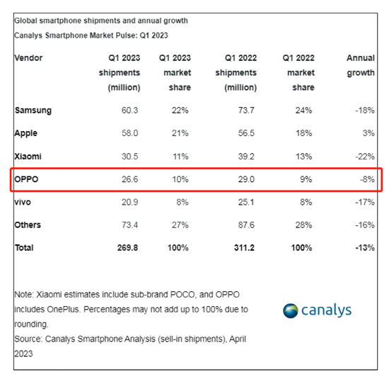 值得注意的是,OPPO尽管一季度出货量排在前位,但与去年同期相比,出货量有所下降,同比降幅8%。另据Canalys数据,今年一季度,国内手机销量为6760万部,为2013年以来最低。