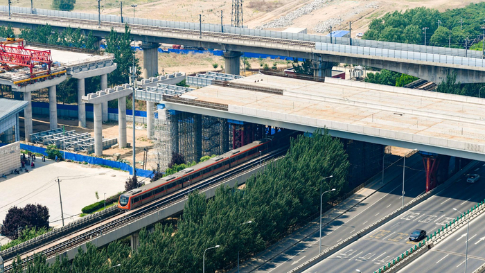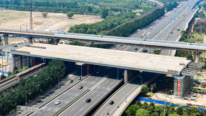 身旁是飞驰的地铁房山线,头顶横跨着京雄高速、京广高铁,今后市民行驶在房山京良路上,可以感受这般独特体验。今天上午,记者在京良路附近的施工现场看到,高耸的高速桥梁已经依次跨过京良路和地铁房山线,桥梁下方,京良路主辅路车流川流不息,与其并行的地铁房山线一趟趟列车稳步通过,丝毫不受影响。