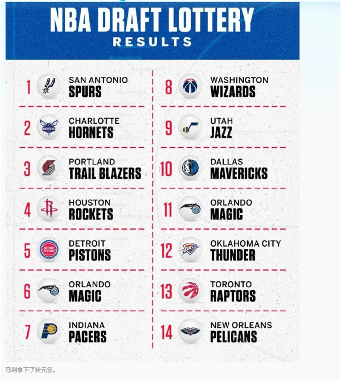 17日上午,NBA选秀乐透抽签仪式结束,马刺抽中状元签,黄蜂选中榜眼签,探花签属于开拓者,火箭抽中4号签,活塞获得5号签。第6-14号签为:魔术6号签,步行者7号签,奇才8号签,爵士9号签,独行侠保住第10号签,魔术从公牛获得第11号签,雷霆12号签,猛龙13号签,鹈鹕14号签。