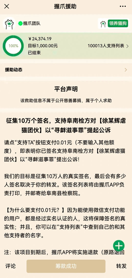 “设定1分钱的签名最低门槛,也是为了规避此类质疑声。截止5月16日晚上,我们收到的两万多元已全部按事先约定原路退还。”吴炜峰说,退的是金钱,留下的是10万人保护动物、严惩肇事者的决心。