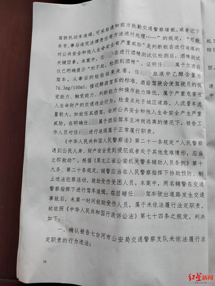 “我们承认酒驾是不对,但交警也不能死命追,把人给追没了啊。”为此,任某家属将七台河市公安局交通警察支队(下称:七台河交警支队)告上法庭。