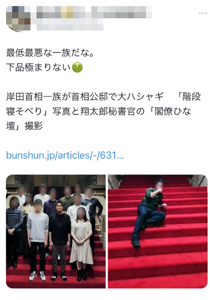 《周刊文春》称,该媒体获得的照片显示,岸田翔太郎等人模仿组建新内阁时的场景拍合影,他本人还站首相应该会站的C位。从这张照片可以看出,岸田翔太郎明显是此次“骚动”的中心人物。此外,还有一些照片显示,据消息人士称是岸田文雄侄子的男子躺卧在首相公邸内的台阶上,岸田家族的亲戚互相模仿内阁大臣,或者站在首相演讲台后摆姿势。《周刊文春》评论称,可以从这些照片中看出来岸田翔太郎等人“为所欲为”的样子。