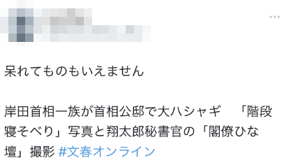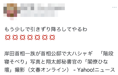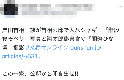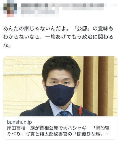 《周刊文春》的爆料很快在日本网络上激起愤怒,一些日本网友喊话要求岸田翔太郎以及岸田文雄辞职。有人批评称,“那可不是你家,不知道‘公邸’的意思,那你们全家都不要参与政治了”。