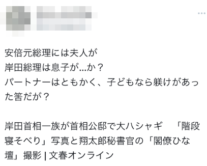 另一方面,有一些人联想到已故日本前首相安倍晋三的情况,日媒此前曾报道安倍夫人让安倍晋三陷入森友学园等丑闻,有网友评论称,“安倍有他夫人,岸田有他儿子。先不说伴侣,子女应该能靠管教吧?”