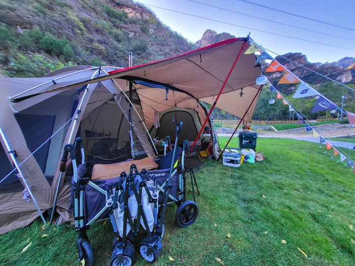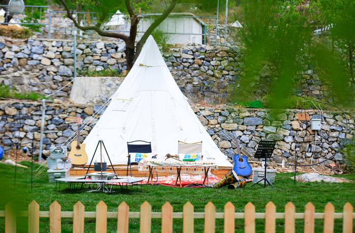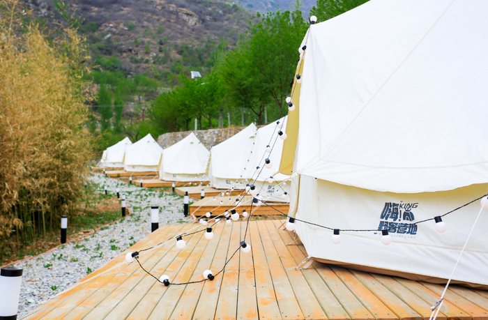 柿柿如意嗨king野奢营地位于北京市房山区张坊镇大峪沟村(中国磨盘柿第一村),是北京市第一家配置专业车尾帐的营地。除了车尾帐区域,还配有拎包入住的豪华私密帐篷区、花海帐篷区、自带装备区、活动区、服务中心、卫生间、淋浴间等,配套设施齐全。营地处于村子最里面半山腰,三面环山,被柿子树、枣树、桃树整体覆盖,满园绿色填充下,颇有精致小森林的感觉。整个营地全年营业,不同季节有不同的露营体验。