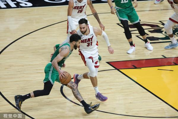 塔图姆的求胜欲望在这场比赛中完全展现,他刻意减少了三分球出手,更多地冲进内线制造杀伤。光是上半场,他就赢得了11次罚球。不管是巴特勒还是其他热火防守球员,似乎都无法限制面临被逼到绝境的塔图姆。