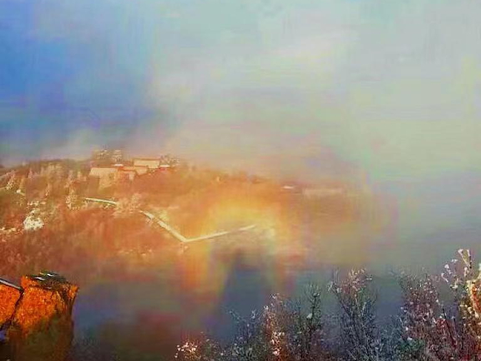 百花山拥有花、路、云、光、寺五大景观,这里的气象景观独特,每当山顶云雾放晴,气象条件具备(阳光、云雾、地形),就会出现七彩光环,人在影中,会如影随形,是难得一见的光学现象。