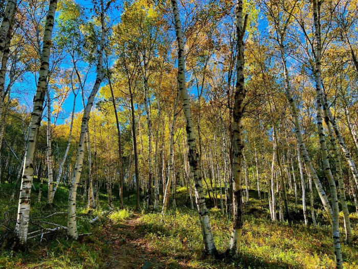 秋林铺白桦林位于松树南坡段,生长着50000余株野生白桦树,面积1000余亩,形成了自然景观林,这里春夏山岭叠翠,秋季满目金黄,冬日随风摇曳,堪称森林中的美人,拥有诗情画意,万种风情。