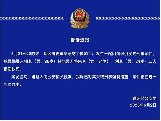 6月2日,江苏南通通州区公安局通报,5月31日20时许,通州区川姜镇某家纺个体加工厂发生一起因纠纷引发的刑事案件,犯罪嫌疑人郇某(男,36岁)持水果刀将朱某(女,51岁)、刘某(男,24岁)二人捅伤致死。案发当晚,嫌疑人向公安机关投案,警方已对其采取刑事强制措施,案件正在进一步侦办中。