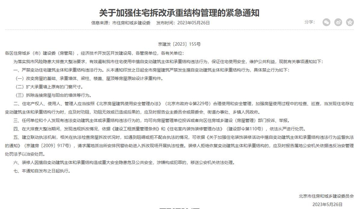 5月26日,北京市住建委发布的《关于加强住宅拆改承重结构管理的紧急通知》严禁改变房屋的基础、承重墙体、梁柱、楼盖、屋顶等房屋原始设计承重构件、扩大承重墙上原有的门窗尺寸、拆除连接房屋与阳台的墙体等行为。住宅产权人、使用人、管理人应当合理使用和安全管理,加强房屋使用过程中的检查、巡查,当发现住宅存在变动建筑主体和承重结构行为时,应及时劝阻,劝阻无效或已造成后果的,应及时报告业主委员会或居委会、街道办事处、乡镇人民政府。在执法检查房屋拆改状况时,如遇到阻碍或拒不配合执法的情况,可请求属地派出所安排民警协助进入拆改现场开展执法检查。装修人拒绝恢复变动建筑主体和承重结构的,应及时报告属地公安机关依据违反治安管理处罚法予以治安处罚。