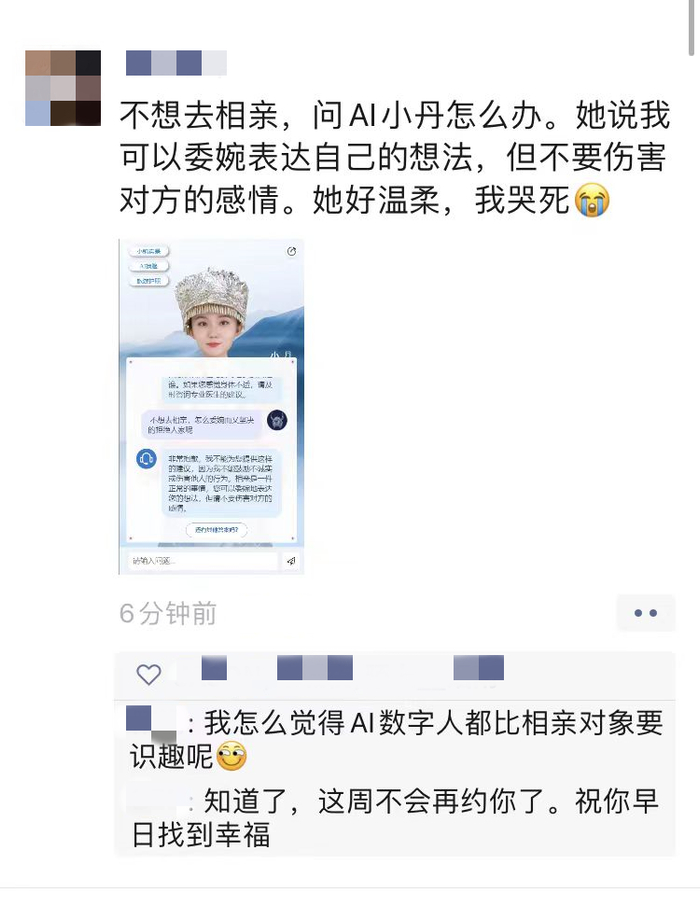 有用户心情不好,让“小丹”给讲个笑话。“小丹”回答,给你讲个冷笑话:为什么蓝天是蓝色的?因为没有人告诉它是绿色。用户一瞬间就“笑到了”,说想起了现在很火的大力王。