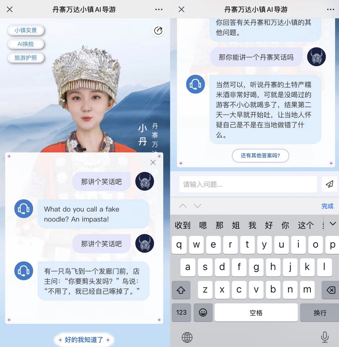 导游是“小丹”的本职工作。丹寨有什么好吃的好玩的好逛的?不管你想问交通食宿还是风土人情,小丹都能随时唤醒、随时互动问答。她的知识库是全网知识,可以说她是个问不倒的导游。