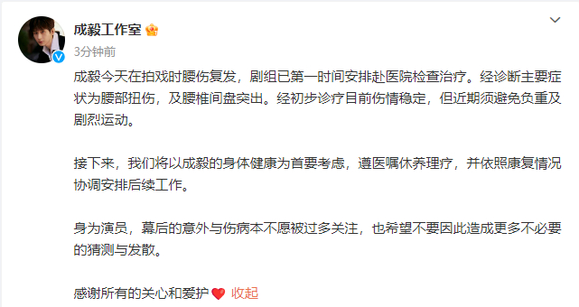 成毅工作室回应其拍摄时受伤,腰伤复发已及时就医