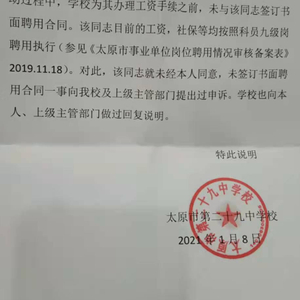 在一份盖有太原市第二十九中学校公章的情况说明上,红星新闻记者看到,该校在2021年1月8日曾向当地法院说明,柳某在调入该校的调动过程中,学校在为其办理工资手续之前,的确未与其签订书面聘用合同,目前是以科员九级岗标准在为其发放工资。只是对于未签订书面合同一事,该校表示,曾就此事向上级主管部门提出过申诉,也向柳某本人做过回复说明。