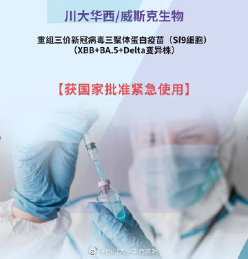 新京报讯 据四川大学华西医院官博消息,2023年6月8日,经国家相关部门批准川大华西/威斯克生物研发的重组三价新冠病毒(XBB+BA.5+Delta变异株)三聚体蛋白疫苗(Sf9细胞)--威克欣®3价XBB疫苗纳入紧急使用,这是全球首个获批紧急使用的针对XBB等变异株的新冠疫苗,预计未来1-2月,公众可接种该疫苗。