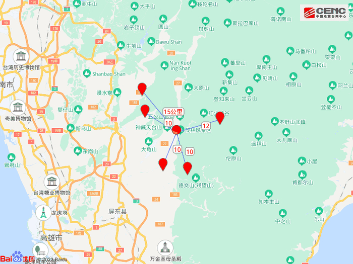 据中国地震台网正式测定,6月10日13时31分在台湾高雄市发生4.7级地震,震源深度14公里,震中位于北纬22.88度,东经120.65度。