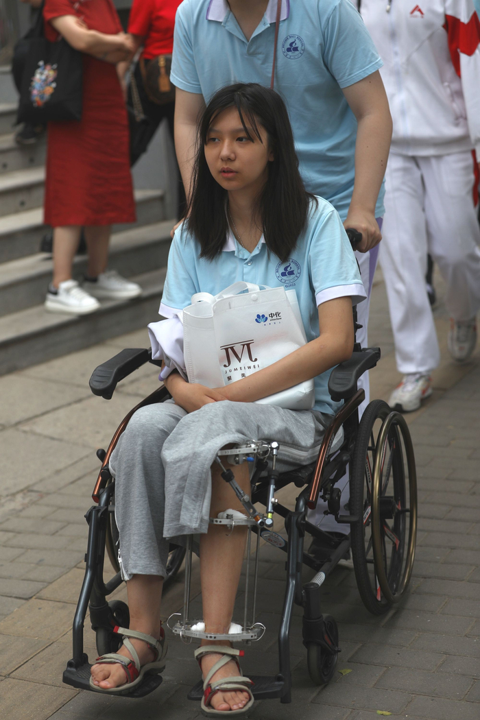 6月7日,陈经纶中学考点,语文考试结束后,一位脚踝受伤的考生走出考场。