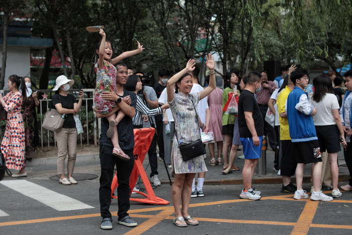 6月8日,第十八中学考点,英语考试结束,考生家人看到考生走出考场时,挥舞手臂迎接。